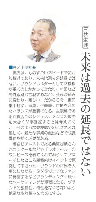 三共生興 未来は過去の延長ではない(繊研新聞 2026年3月5日付) 2026.03.05 三共生興株式会社 2026年3月5日、繊研新聞にて当社記事が掲載されました。 ◆繊研新聞ホームページ https://senken.co.jp/