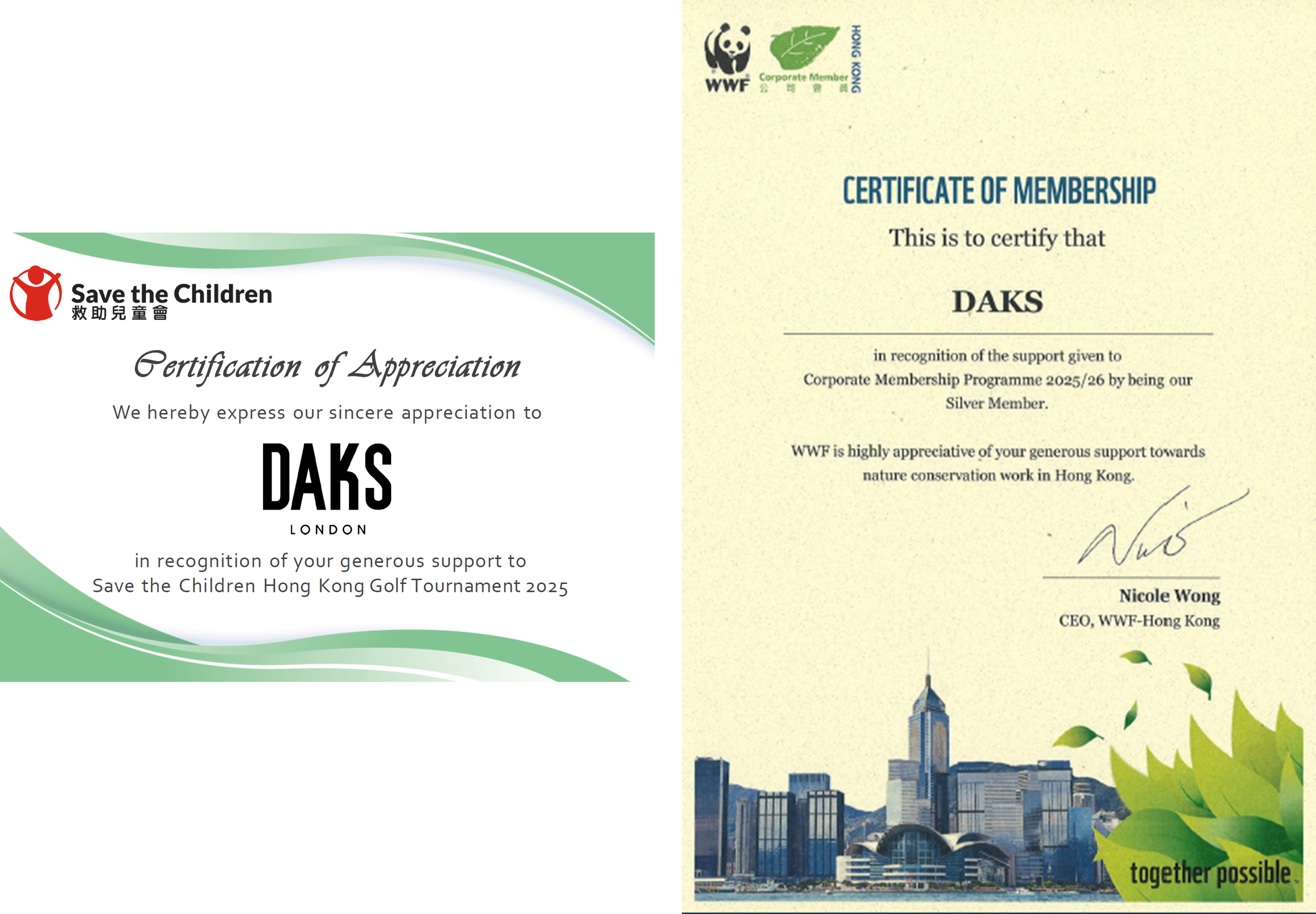 英国王室御用達ブランドDAKSは、昨年様々なチャリティー活動を支援し、感謝状を頂きました。